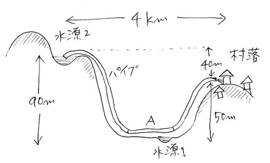 | タイでのゴンゴバの活動の一つが給水システムの構築である。下図を参照してほしい。それまではこの村の人達は、水源1まで毎日水汲みに出かけ水を確保していた。これはかなりの重労働であり、そのため生活に必要な最低限の水しか運べない。そこで、村から4km離れているが、標高のより高い位置にある水源2から水を引くことにした。その全長にわたってパイプを敷くわけだが、水源から一旦90m下の平地までおろし、そこから50mの高さの村まで水を上 げ、その差40mの圧で村に水を供給する。原理だけ述べると簡単なようだが、Aの部分のパイプには90mの水圧がかかるため破裂の危険性があり、また土砂により時々閉塞することもあり、この設置にはかなりのノウハウを必要とする。この方式を考え出したのは、現地で少数民族支援のNGO活動をしているクニカ氏である。このクニカ氏の指導のもとに学習院とタイの学生がパイプを敷いた。この方式の良いところは、モーターなどの動力を全く使わないことだ。設置もその維持管理も人手だけでできる。土砂によるパイプの閉塞は定期的にAの部分のパイプだけを掃除すればよいし、万一破損したときは一時的に竹を使って代用できる。 その結果、一度給水システムを設置すると、村人だけで永続的に管理・利用できる。 このようにして湧き水を水源として、村の各戸に水道を設置できるようになった。これにより、村人が重労働から解放され、その時間をもっと別のことに費やせるようになる。常に水を利用できるため料理、洗濯、水浴びなど日常生活に必要な事柄が画期的に便利になる。トイレも水洗にできる。最先端の医療がなくても、衛生環境をよくするだけで、かなりの伝染病、皮膚病、胃腸病などを予防できる。 その結果、わずか1年の間に18戸だった村の戸数が31戸に増えた。今回、村を訪れたときはさらに2戸ほど建築中だった。村の人口も倍に増えた。 人類の文明は大河の流域から生まれた。水は人間にとって根源的のものである。タイの少数民族の中にも人類の文明発祥の原型を垣間見ることができる。 |