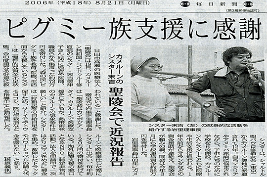 シャルトル聖パウロ修道女(東京)から、熱帯雨林という厳しい気象条件のカメルーン奥地に派遣されて12年。3年振りの一時帰国で貴重な日本滞在期間の最中、わざわざ聖涼祭に駆けつけて下さったシスターは、相変わらず優しく、静かに微笑んでいました。 高倉 |